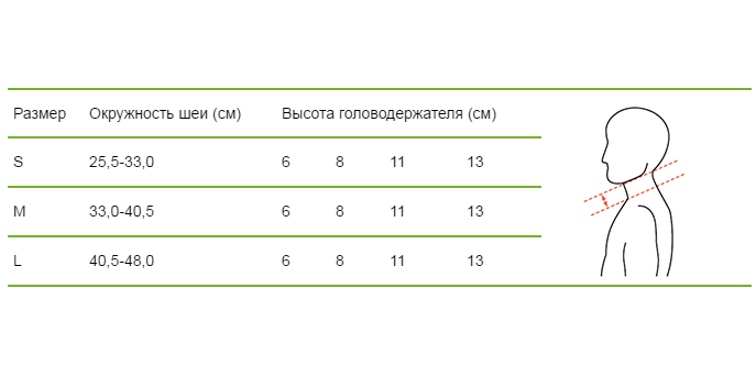- Размер головодержателя (S, M, L) выбирается в зависимости от окружности шеи. Для каждого размера предусмотрена высота 6, 8, 11 и 13 см.
