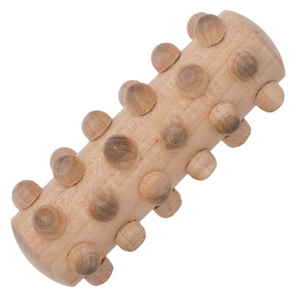 Небольшой роликовый деревянный массажер с круглыми шипами используется для эффективного самомассажа.  Может использоваться на других зонах тела. Удобно брать с собой в дорогу.